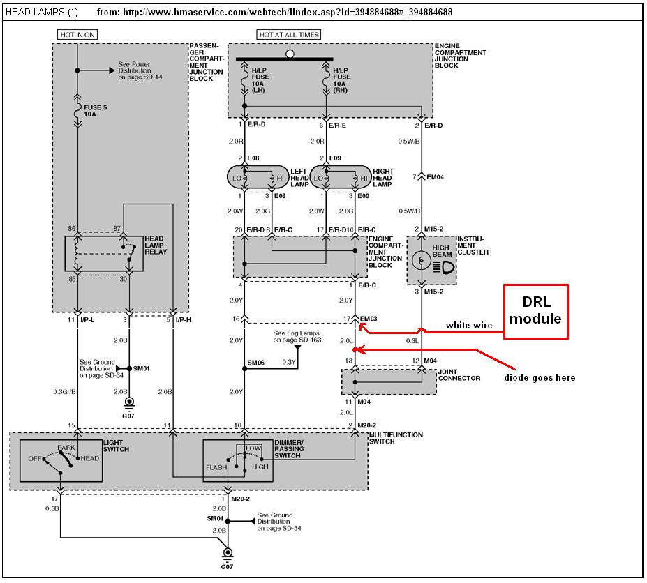 DRL red wire to the I/P-D connector yellow wire (Pin # 14).