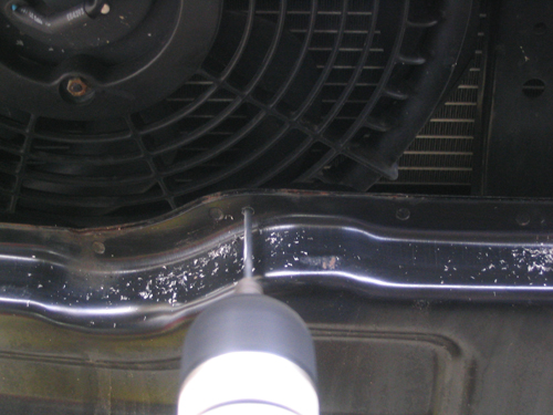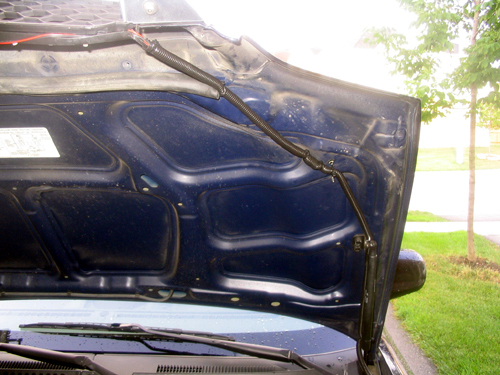 Run the wires up the inside of the hood, down the support arm, and in through the hole in the firewall. (See steps 4 below). Covered the wires (if you desire) with some black split loom for cosmetics. Note: You may elect to drill a hole through the firewall, if so this write up might help you. |