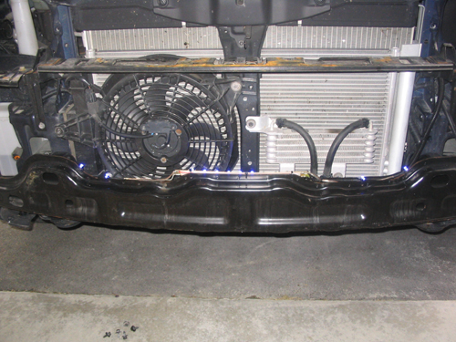 The set in the hood is pretty straight forward, you remove the black support from behind the plastic grille. Then drilled 2 holes evenly spaced in each end of the bar and then attached the 4 Varads there, then cable tied the circuit board to the outside of the support, facing inwards towards the radiator. You may elect to use cable ties instead of drilling, but they might shift over time. |