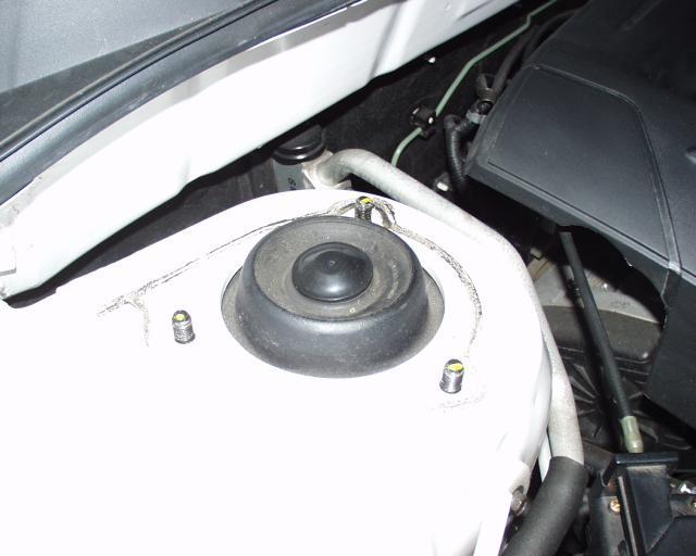 The Strut Bar will be seated on top of the Strut/Shock towers. Remove the three bolts using the 10mm socket wrench. |